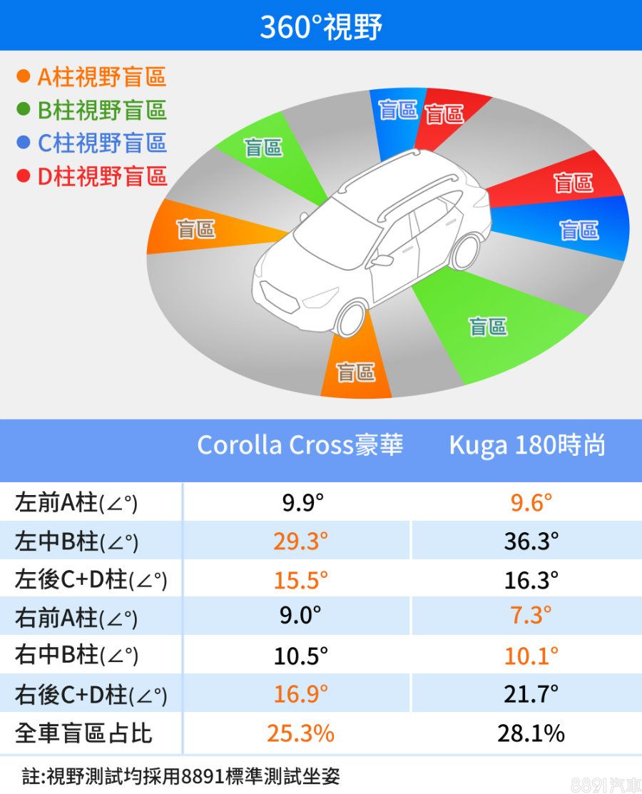 即便未有A柱三角窗的加持,Kuga不論左或右側A柱的遮蔽範圍都比Corolla Cross略小,加上坐點較高,視野相對出色;但論及整個環艙視野仍是Corolla Cross比較好,尤其是左半邊的遮蔽範圍較小。