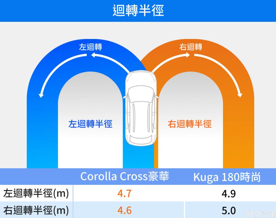 尺碼小一號的Corolla Cross在迴轉半徑取得優勢,左右皆落在5米以內,相較於Kuga更適合窄巷掉頭及市區穿梭。
