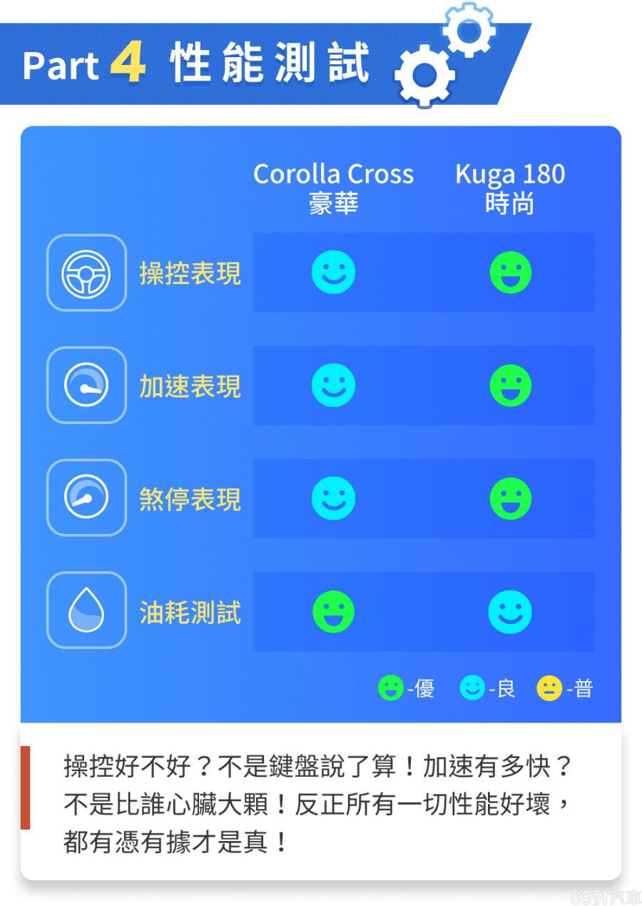 單就測試結果來看,Corolla Cross多方面仍比不上高一級的Kuga,大致上就是越過及格標準,沒有突出的優勢,也沒有明顯不足,過往受測的Altis、RAV4也有類似情形,就是大家心中該有的「豐田印象」,也符合80萬該有表現。