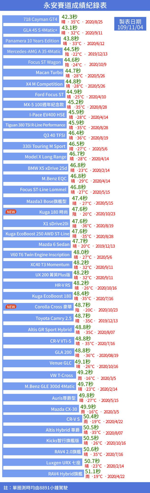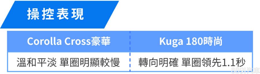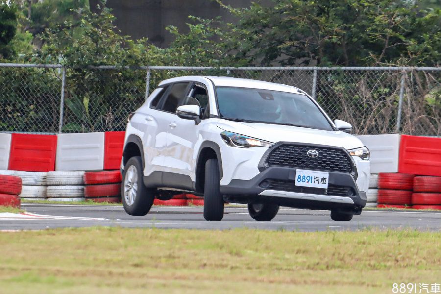 Corolla Cross避震器阻尼頗為柔軟,在路面相當平整的永安卡丁車場裡,雖然過彎側傾明顯,但沒有太多晃動,然而面對連續左右切換時,有重心轉換較慢的情形,讓身手俐落度沒像Kuga 180那麼好,轉向反饋的隔閡也較多一點,另外配胎瑪吉斯HP5也不善於激烈操駕,不僅影響過彎速度,連出彎加速都被犧牲,因為很多時候出彎時,內側輪出現明顯空轉,動力流失、讓車輛無法有效加速,自然影響了單圈表現。另一方面,這具CVT變速箱手排模式下,齒比設定剛好是2檔跑完全程,常有2檔出彎力道不夠的情形,也同樣影響了單圈時間,最後Corolla Cross的最快單圈紀錄是48.7秒,比對手慢了1.1秒。