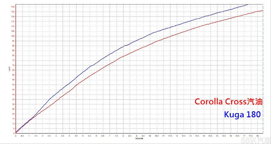 這是兩車P Box加速曲線對比,可以清楚看出,Kuga 180起步力道比較直接,一開始就拔得頭籌,車速大約15km/h之後,更是大幅拉開差距,一路直奔終點!