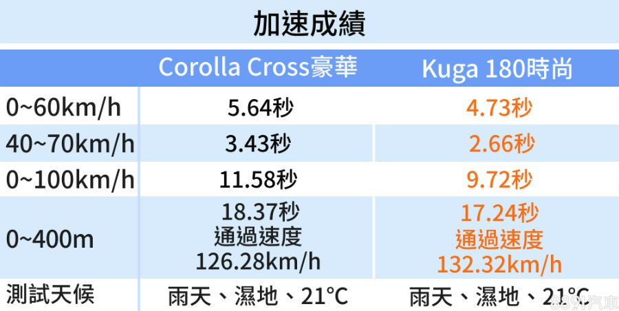 在一般行駛時,Corolla Cross起步稱得上輕盈,但在加速測試時,起步左腳剎車、右腳油門,轉速上限約在2100rpm,起跑瞬間力道相當平淡,甚至可用疲軟形容,最後0~100km/h最佳成績為11.58秒,慢了對手兩秒餘,若你頗為在意動力飽滿程度,那Kuga 180有絕對性的優勢。Corolla Cross變速箱為可模擬7速手自排的CVT,一般行駛下為連續變換齒比,若重踩油門,便會模擬升檔,加速測試時,通過400公尺終點換上5檔,中間每次換檔落差約在1000rpm,看起來相當綿密,但實際上若能發揮CVT特性,將轉速一路定在馬力峰值6400rpm持續衝刺,避免換檔造成的動力落差,相信加速成績可以再好些許!
