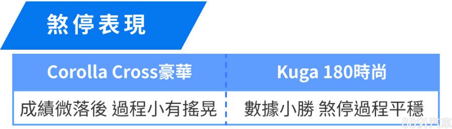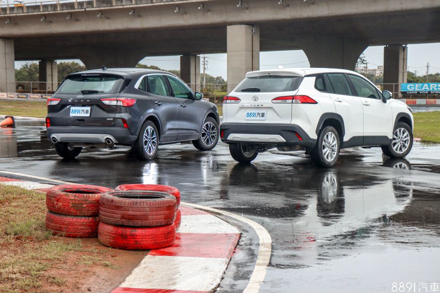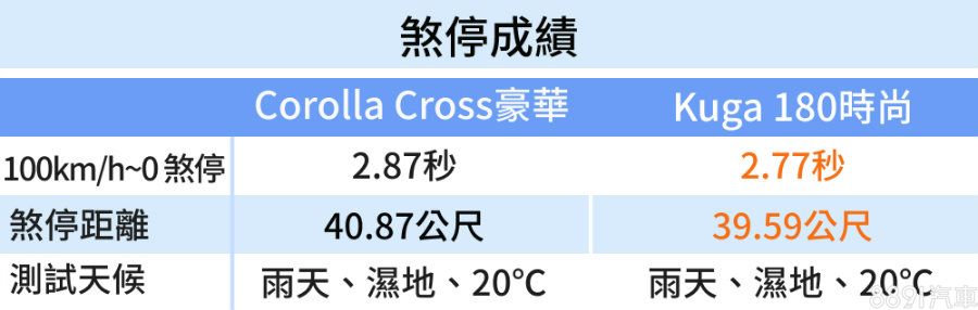 天候與加速測試同為雨天濕地,除了考驗剎車系統效能,也考驗輪胎破水、排水能力。在實測成績上,Kuga 180小幅勝過Corolla Cross,煞停距離短了約1.3公尺,而在測試過程中,全力制動、車尾大幅上抬,Corolla Cross後軸有稍微搖晃感,相形之下,Kuga煞停過程就較為安定。
