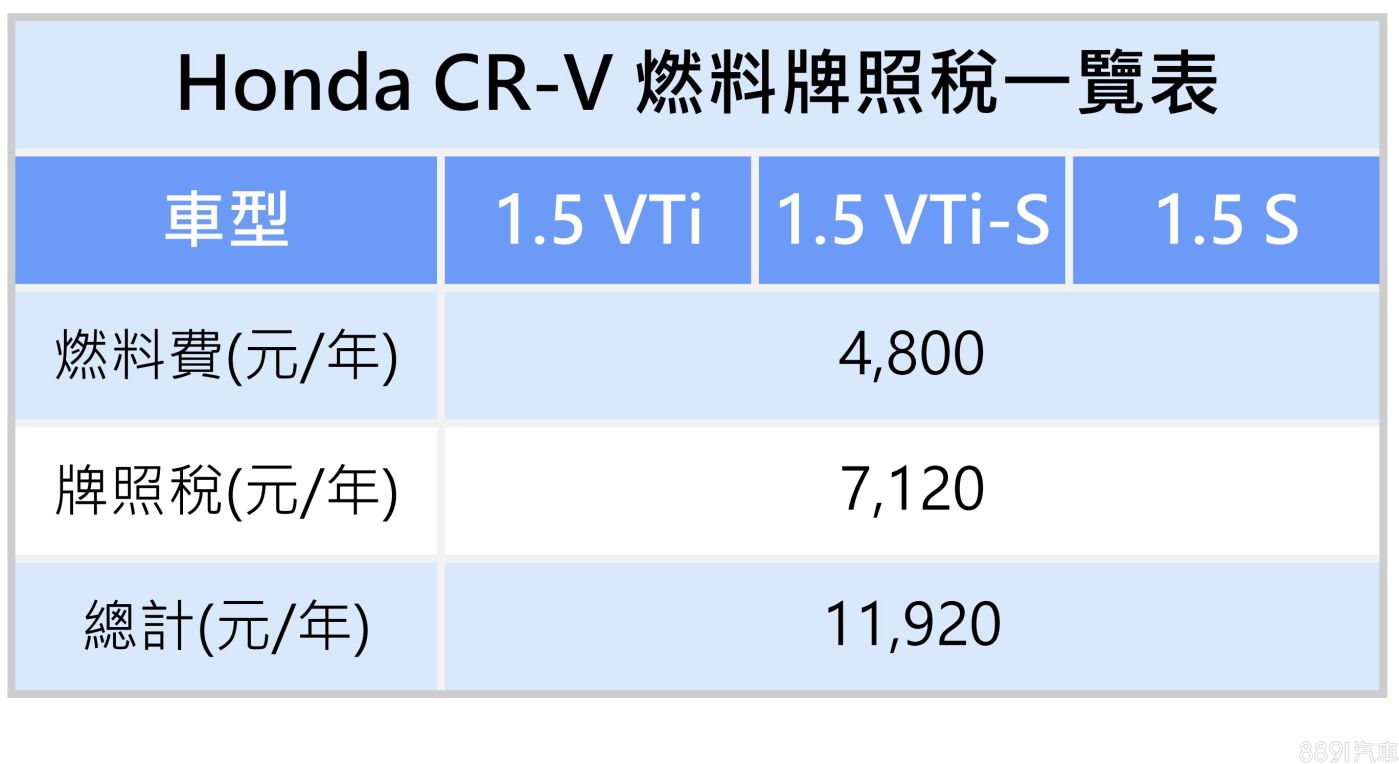為什麼說CR-V很好養呢? 還有個原因在於CR-V一年稅金只要11920元,1.5升引擎就有193hp,這讓誰都心動阿!相較之下,家中那台BMW 520i馬力比CR-V來的小,卻要繳2.0升的稅金。