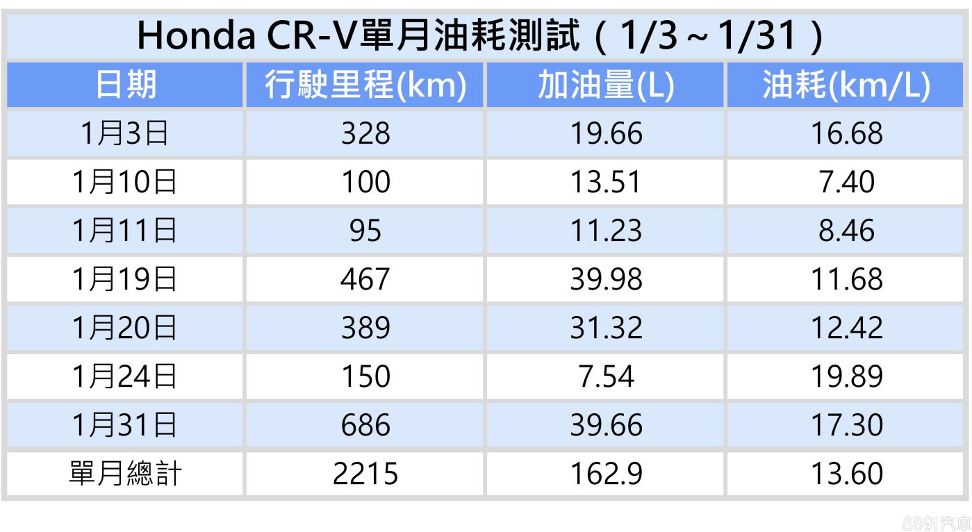 由於個人常常跨縣市往來,試用期間多以高速路段為主,測試的單月下來一共行駛約2215km,總加油量162.9L,平均油耗約13.6km/L,雖不及官方數據理想,但表現並不會太差。