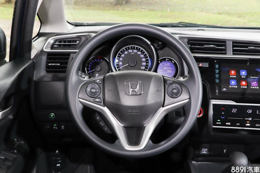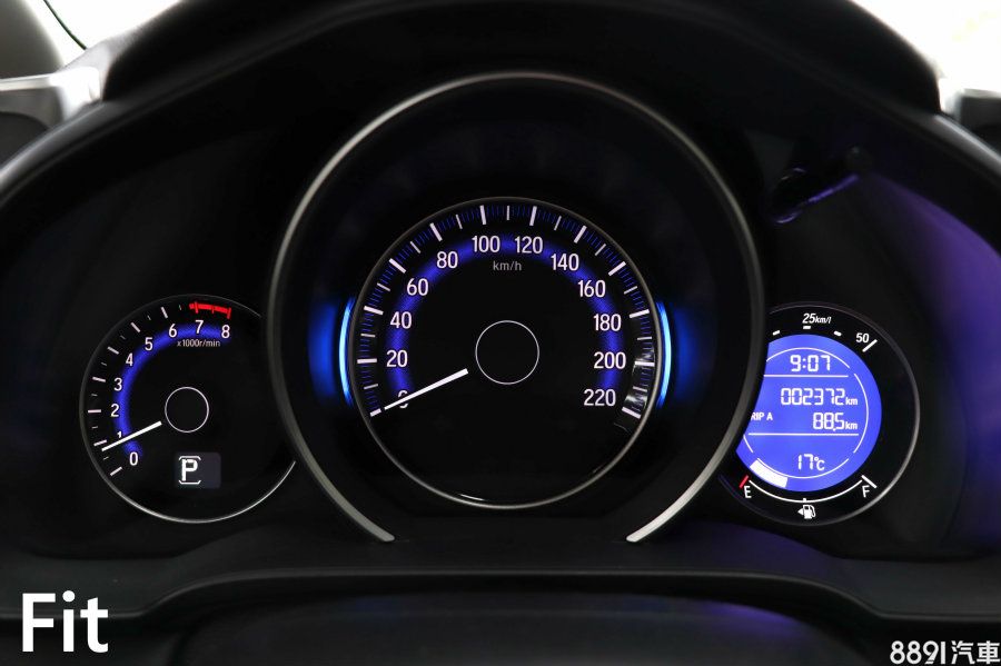 雖然儀錶都是三環造型,但Fit色彩艷麗之外,右側液晶顯示的旅程與油量,自然多了一分科技感。