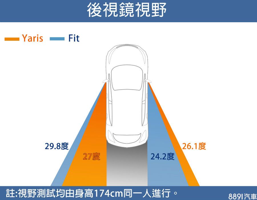在車外後視鏡視野測試上,Fit與Yaris左右邊角度互有領先,若以總度數來看,也相差甚小,這項測試算是平手。