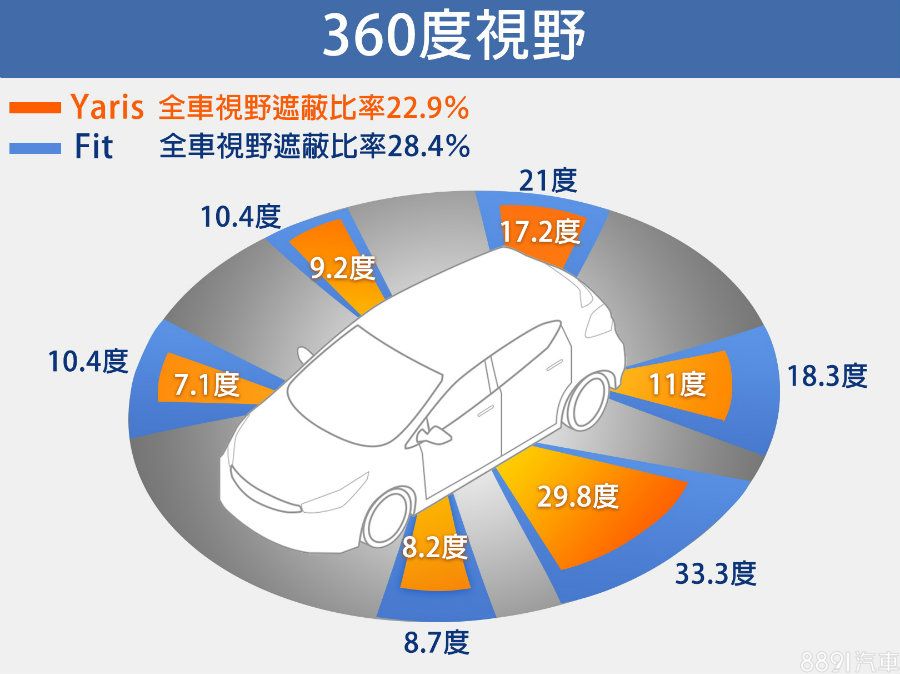 雖然Fit前後可見距離勝過Yaris,但在全車視野測量中,Fit左右A、B、C柱的遮蔽範圍都比Yaris略多一點,此外,Fit後門之後有一小車窗,但從駕駛座向後方望去,C、D柱是重疊在一起的,小車窗對兩側視野無實質幫助。