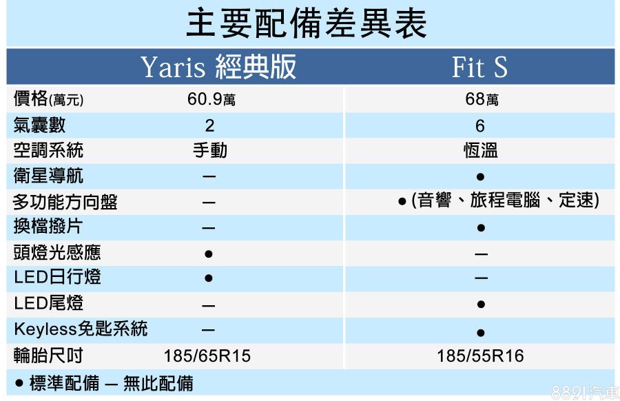 先說明,雖然Fit S和Yaris經典版的價差超過一成,配備自然有高低,但Yaris的高規S版配備就跟Fit S相當了,倒是Fit入門VTi-S價格是65.9萬起跳,不像Yaris有提供更便宜的60萬產品,簡單說,Yaris提供很多規格任君選,Fit則是產品規劃稍高一些。