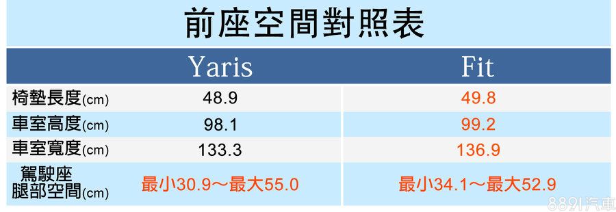 可以清楚看出,除了前後距離調整範圍Yaris較寬廣之外,Fit其餘數據都小幅勝出,加上Fit因前擋風玻璃面積大、車室採光佳,乘坐其中更顯開闊較無壓迫感。