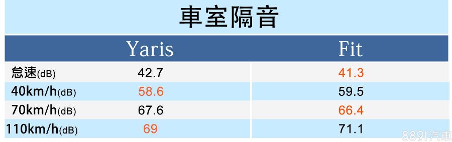 從四項噪音測試成績來看,兩車各有兩項勝過對方,算是平手,不過實際感受上,Yaris傳至車室的音頻比較不惱人,因此若一定要在兩車之間做個評斷,我們是偏愛Yaris!