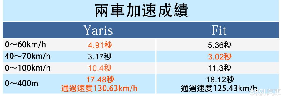 兩車車重都在1100kg左右,而動力略大的Fit,實測加速成績卻未取得領先,其實這也沒太讓我們意外,因為長期以來的試駕經驗,豐田在一般引擎與CVT搭配的協調性相當出色。
