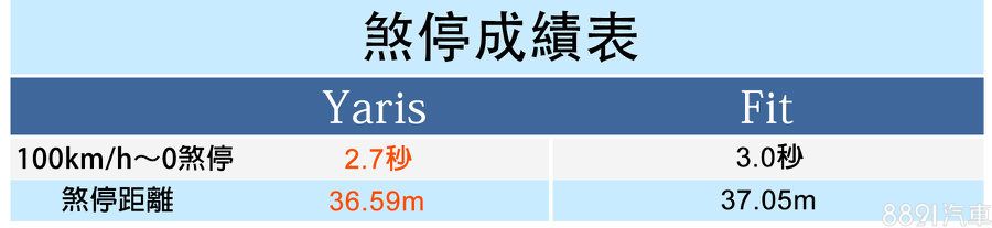兩車各測三趟100km/h~0,各自成績差異沒有太大,若取最佳成績比對,Yaris勝過Fit,煞停距離少0.46m,半公尺的差距看似還好,但煞停能減少1cm都是好事,因為是有撞到、沒撞到,一翻兩瞪眼的結果。