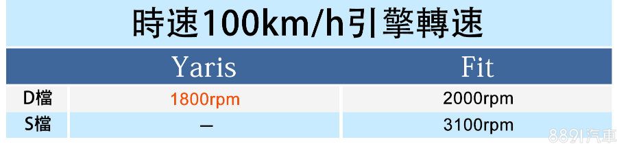 高速油耗的好壞,引擎轉速高低是其中一環節,同樣是D檔之下,Yaris引擎轉速略低一點,而Fit若排入S檔,引擎轉速會攀升到3100rpm,以獲得更好的加速力道,但自然也就不利於油耗了!