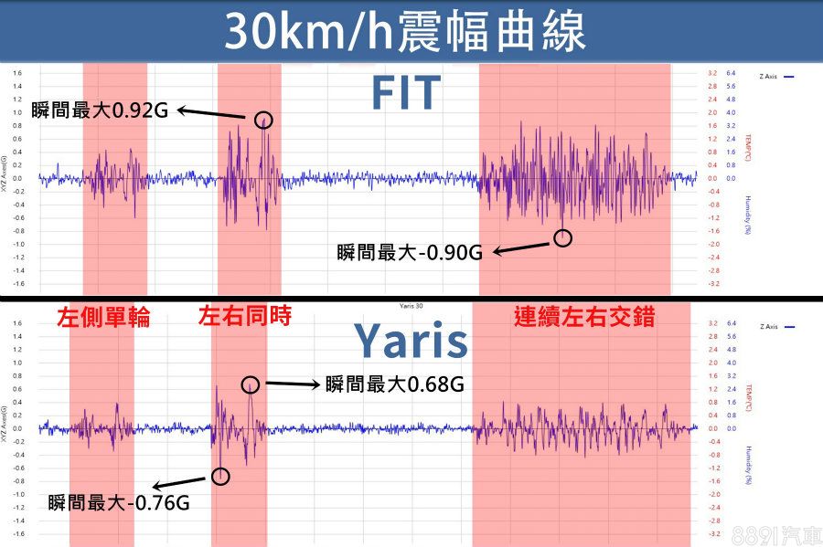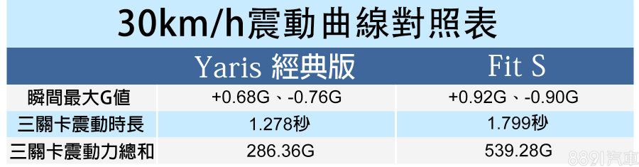 從震動時長來分析,Yaris車體受到上下擺盪G值較小,懸吊處理也因此較有餘裕,震動時長顯著小於Fit;同樣的由於上下G值較小,通過三關卡後Yaris所受的G力總和也顯著小於Fit,顯示30km/h車速時,Yaris乘坐品質優於Fit。