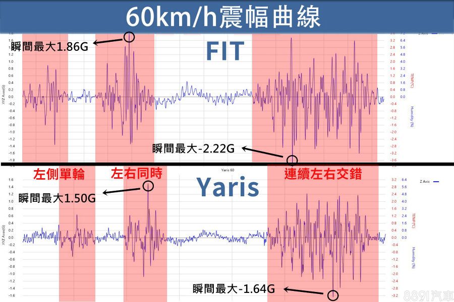 60km/h表現大致呈現與30km/h相同趨勢,Fit瞬間G值來到1.86G與2.22G,衝擊感相對強烈許多,Yaris也因車速提升、瞬間G值也雙雙來到1.5G以上。在連續左右關卡Yaris震動曲線較規律,顯見上下震動依然在懸吊負荷範圍內,表現優於Fit。