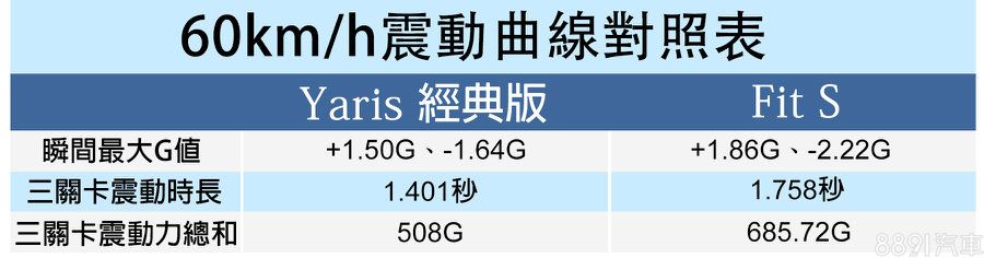 分析結果顯示,Yaris不論瞬間G值、震動時長、G力總和表現都優於Fit,Yaris在60km/h所受的G力總和甚至低於Fit在30km/h的表現,表現著實出色。若在意的是乘坐舒適感,在震動測試歷練後,Yaris毫無疑問是較好的選擇。