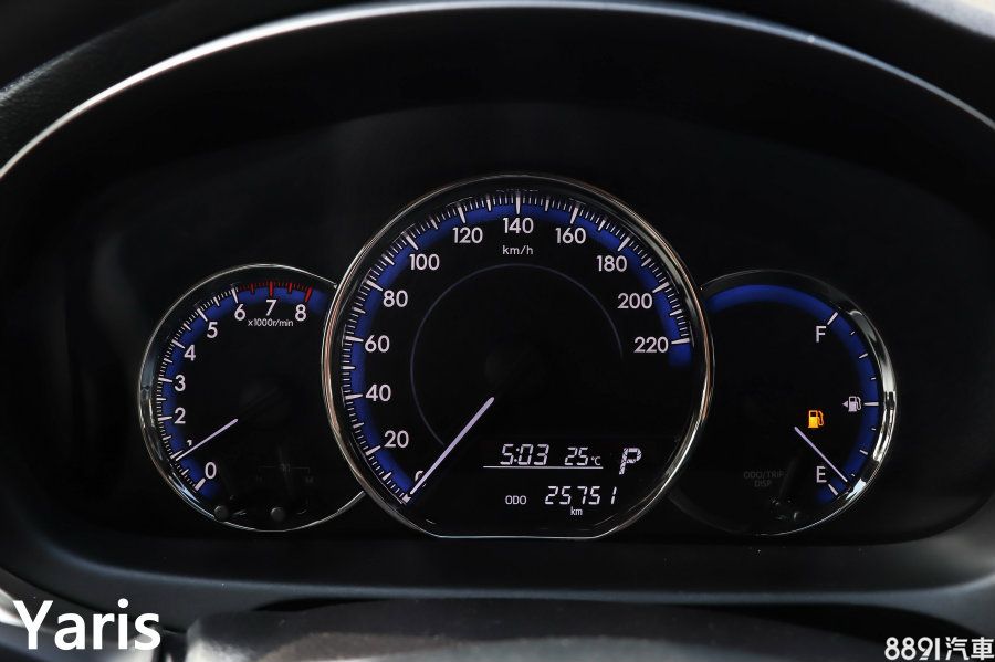 Yaris儀錶設計中規中矩,在外圈刻意加上鍍鉻裝飾,但營造豪華感有限。旅程電腦顯示位於下方,辨識度沒問題,但比起Fit獨立在右側、更大面積的顯示,Yaris此點就顯得辨識稍弱了。