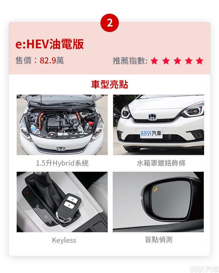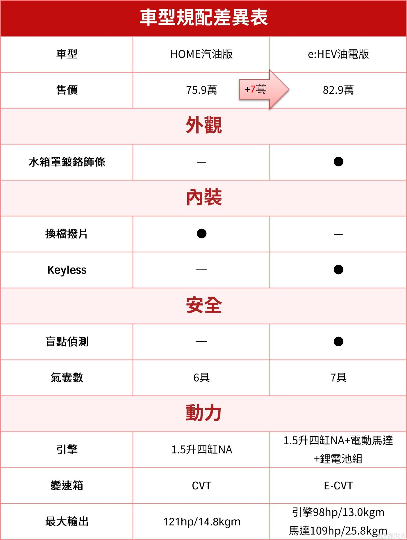 Fit只有汽油、油電兩個版本,在價差7萬前提下其實很好選擇,油電不只能帶來省油效益,在養車成本項目每年可省下1.2萬元,以電驅為主的特性,更能帶來如同電動車般的駕馭感受,至於配備面,多出膝部氣囊、盲點偵測、Keyless,安全性也更加到位,直上e:HEV油電版才是毫無懸念的選擇。