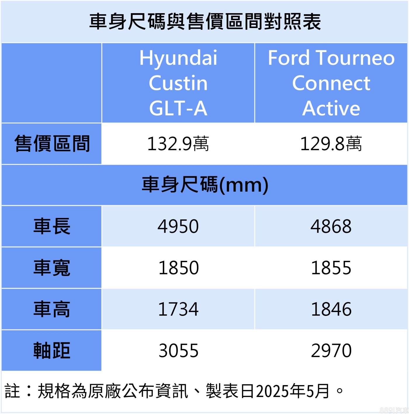 兩款MPV尺碼上稍有差異,Custin車長與軸距都更長,旅玩家身形如火財盒、車高也明顯較高,行李廂空間方正寬敞,外觀還添加車頂行李架,更加強調載貨機能,不過缺點國內不少室內停車場限高1.8米,找停車位時相對麻煩。另外,雖然都是七人座,但座椅配置有差別,Custin是「2+2+3」,可從中央走道進出第三排,旅玩家則是「2+3+2」,僅能立起第二排兩側座椅,才方便進出。