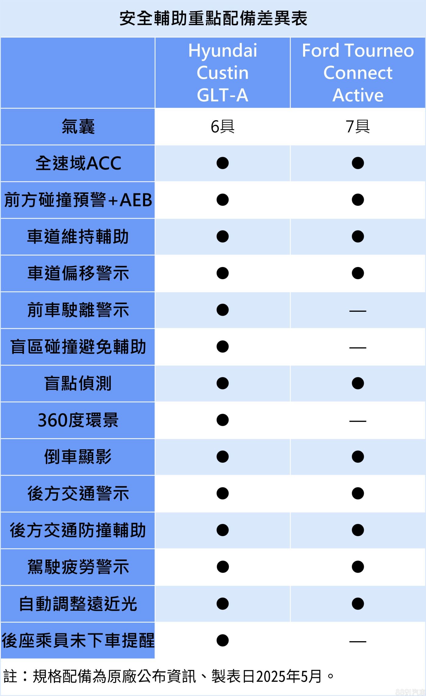 安全都符合市場趨勢,全速域ACC、車道維持、AEB、RCTA都列入標配,滿足Level 2標準,不過細看Custin還是略勝一籌,像是前車駛離提醒、後座乘員未下車提醒、盲區碰撞避免輔助、360度環景等實用功能也都納入行頭,尤其這類大車視野較差、出入窄巷負擔也大,有環景攝影輔助絕對會更有幫助。