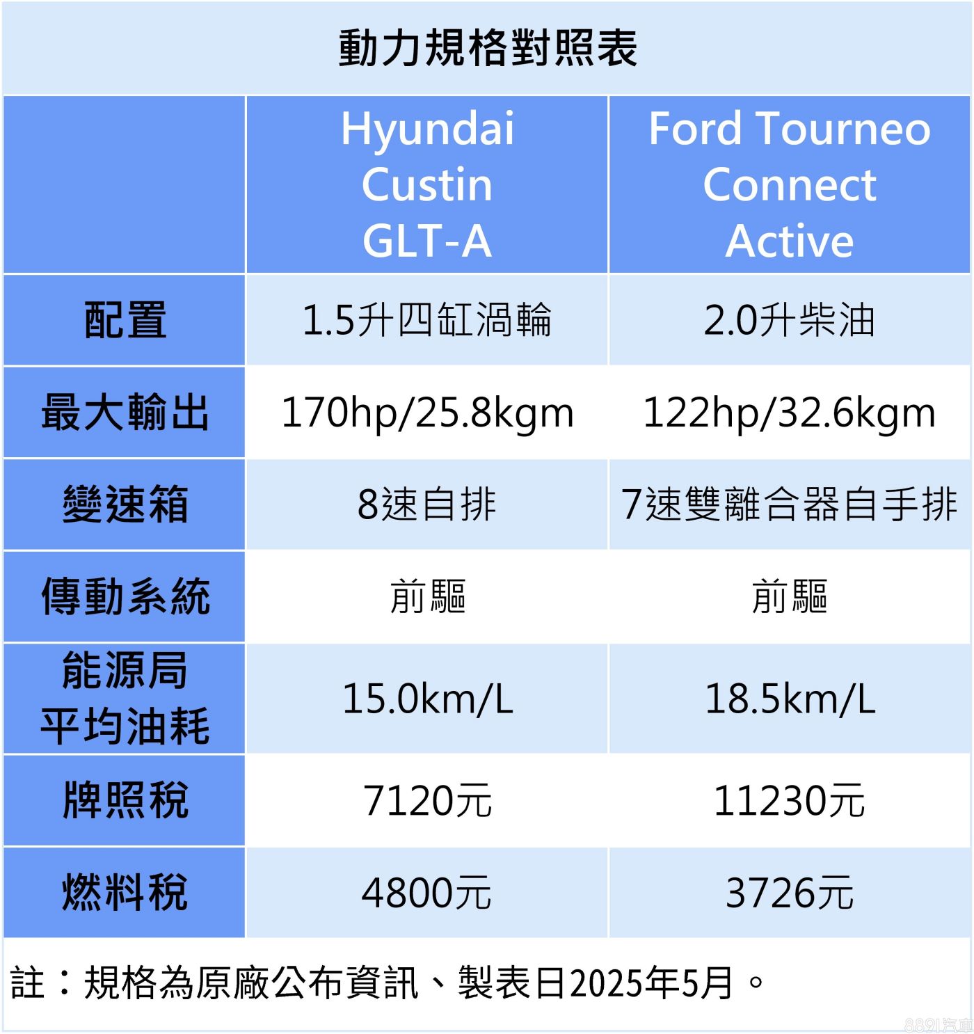 動力配置截然不同,Custin採1.5升四缸汽油渦輪+8速自排,而福特旅行家採2.0升四缸柴油渦輪+7速自手排。Custin贏在稅金更省,由旅行家則是仗著柴油引擎的優勢,扭力更大、油耗也更漂亮,不過相反的需定期添加尿素,也會是一筆養車成本。