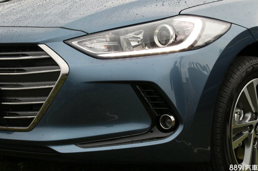 Elantra LED日型燈由下往上勾勒,視覺感受還不錯,不過LED日型燈與HID頭燈皆為2.0汽油菁英標配,其他車型則是以霧銀飾條取代LED日型燈的位置;細看前霧燈組有四道導流鰭片,原廠宣稱具有空力效果能減少油耗,不過在基本款的1.6汽油豪華型則無前霧燈設置。