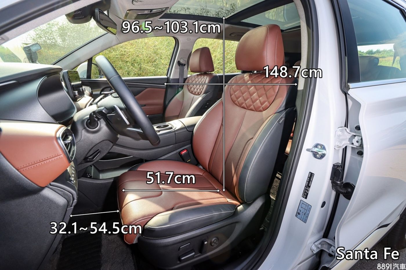 Santa Fe前座在寬度與高度表現都出色,尤其最大達103.1cm的頭部空間是同場之最,可以對應更多駕駛身形,不過數據上看不到的是,排檔座與中央扶手相連的高聳設計會讓人感到略微壓迫。