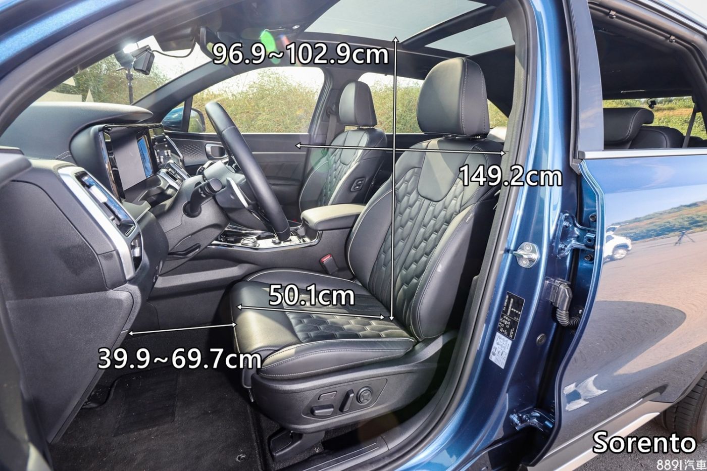 雖然Sorento車身尺碼不是最大,但靠著方正的車身線條設計,前座寬度是同場之最,搭配低矮的中央鞍座設計,一入座就能感到寬敞的開闊感,且在高度部份也僅次於Santa Fe,整體表現十分優異。