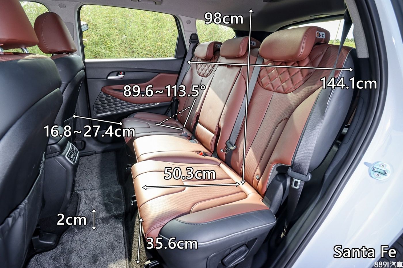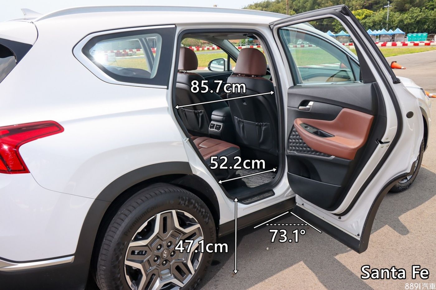 Santa Fe後座優勢是有最佳的車室高度,加上地板平整、橫向寬度也出色,有相當寬敞的乘坐空間,不過小缺點是後門開口較不足,85.7cm的最寬處是五車之中最窄的,這部份在第三排乘客進出時影響最明顯。