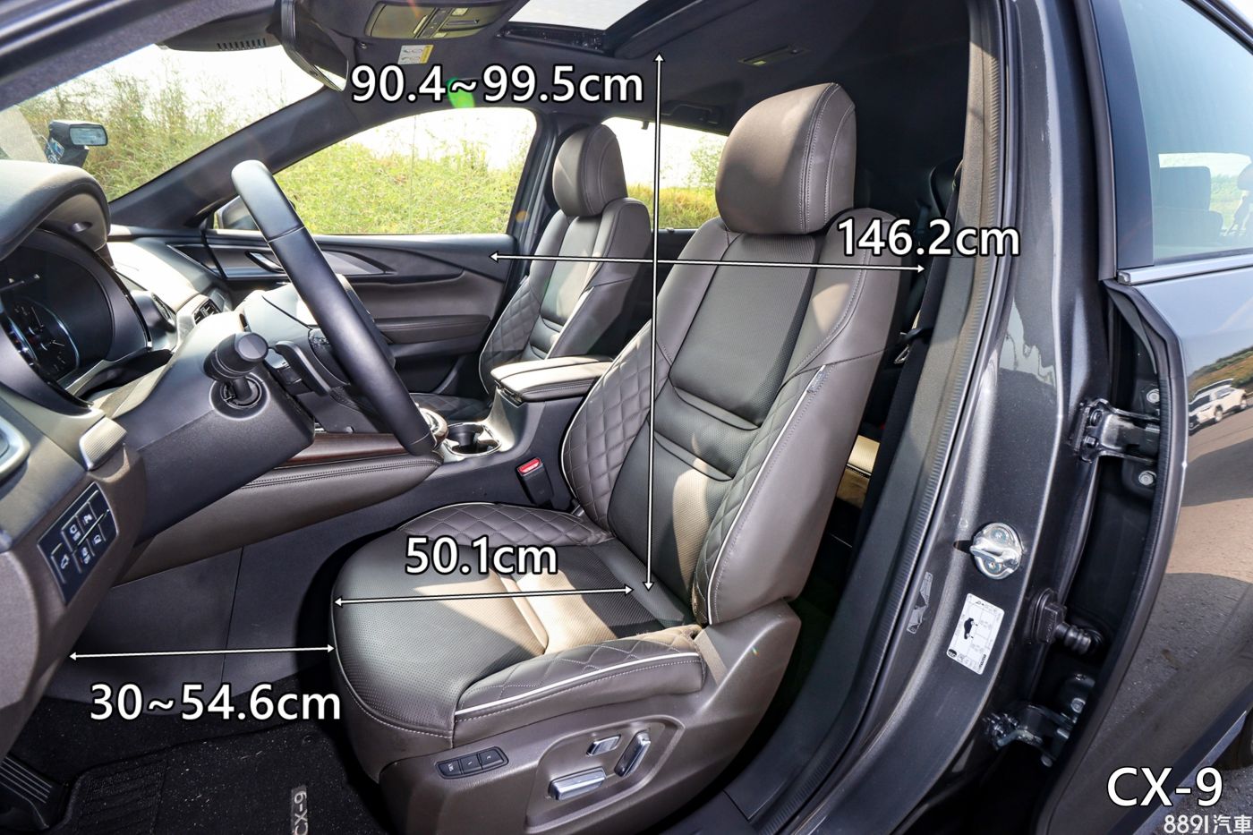 CX-9車身尺碼是同場最大,不過在前座並未展現出明顯優勢,這部份也與本身的線條、門板厚度有關,但整體來說,實際感受到的仍是開闊,體感上沒有明顯不足處。