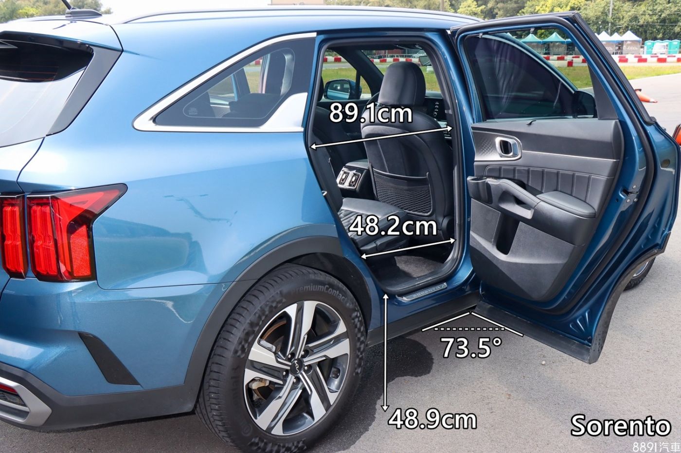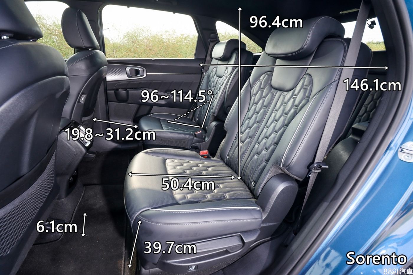 來到第二排,Sorento依舊繳出最佳的車室寬度,而在六人座配置下,兩張後排獨立座椅的尺寸非常寬大,中間空出的小走道也方便第三排進出,唯一缺點是後座門檻離地高達48.9cm,是五車中最高的,對於年長者或小朋友可能會需要多加注意。