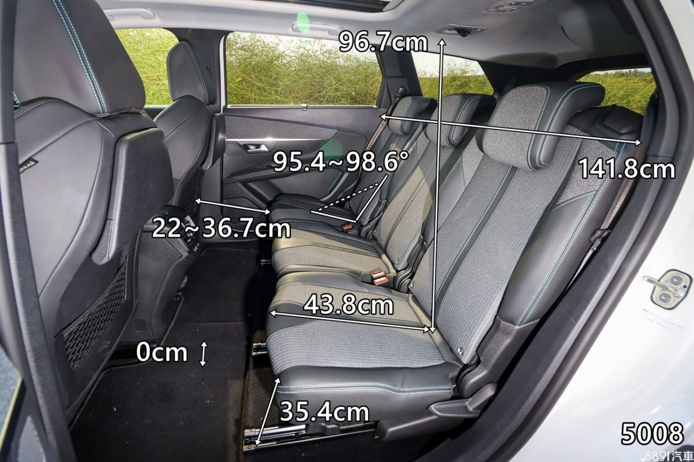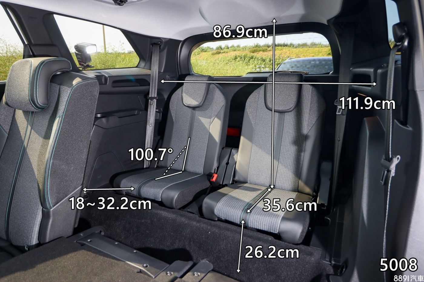 5008第三排橫向寬度與座椅面積表現皆差強人意,不過受惠於平直的車頂設計,頭部空間是全場最佳,加上面積頗大的後排窗戶,可以有效緩解壓迫感。