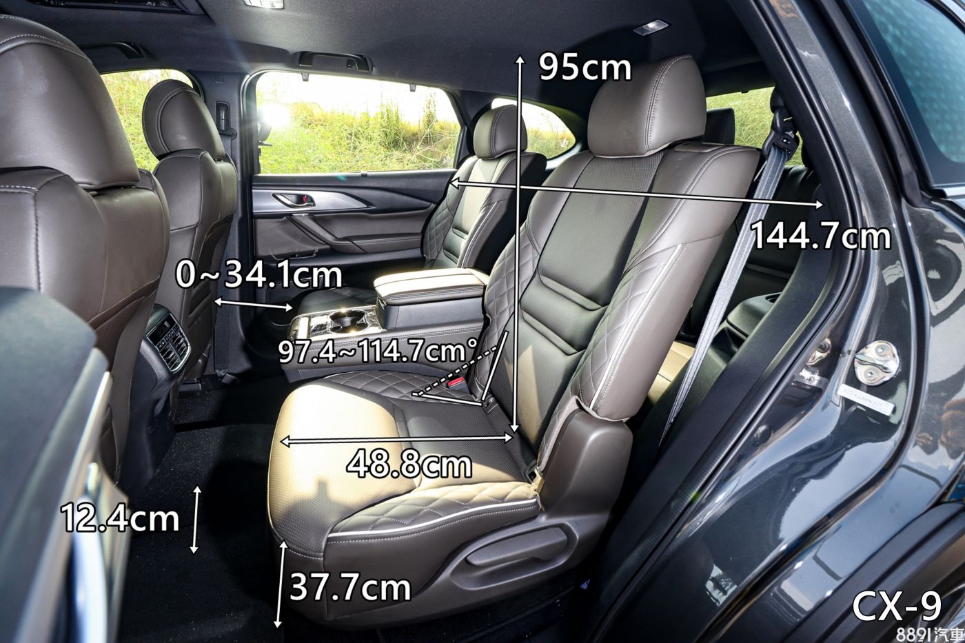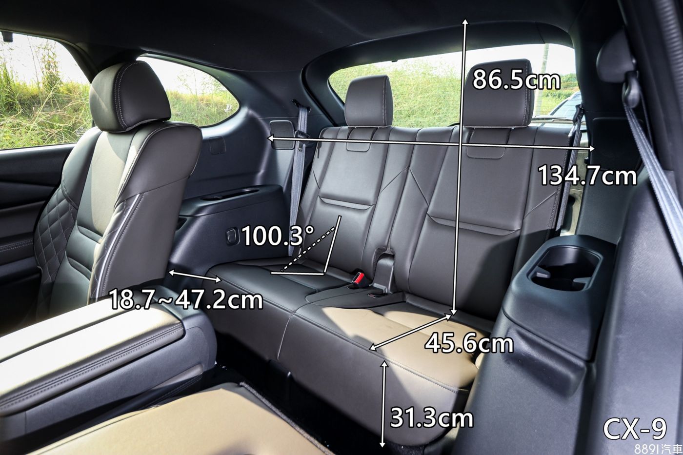 不論車室寬度、膝部距離等多項數據,CX-9都是同場最佳,且光看座椅造型就知道,CX-9有最舒適的第三排乘坐空間,不像其他四車的第三排座椅相對侷促,乘客不會淪為「次等公民」。