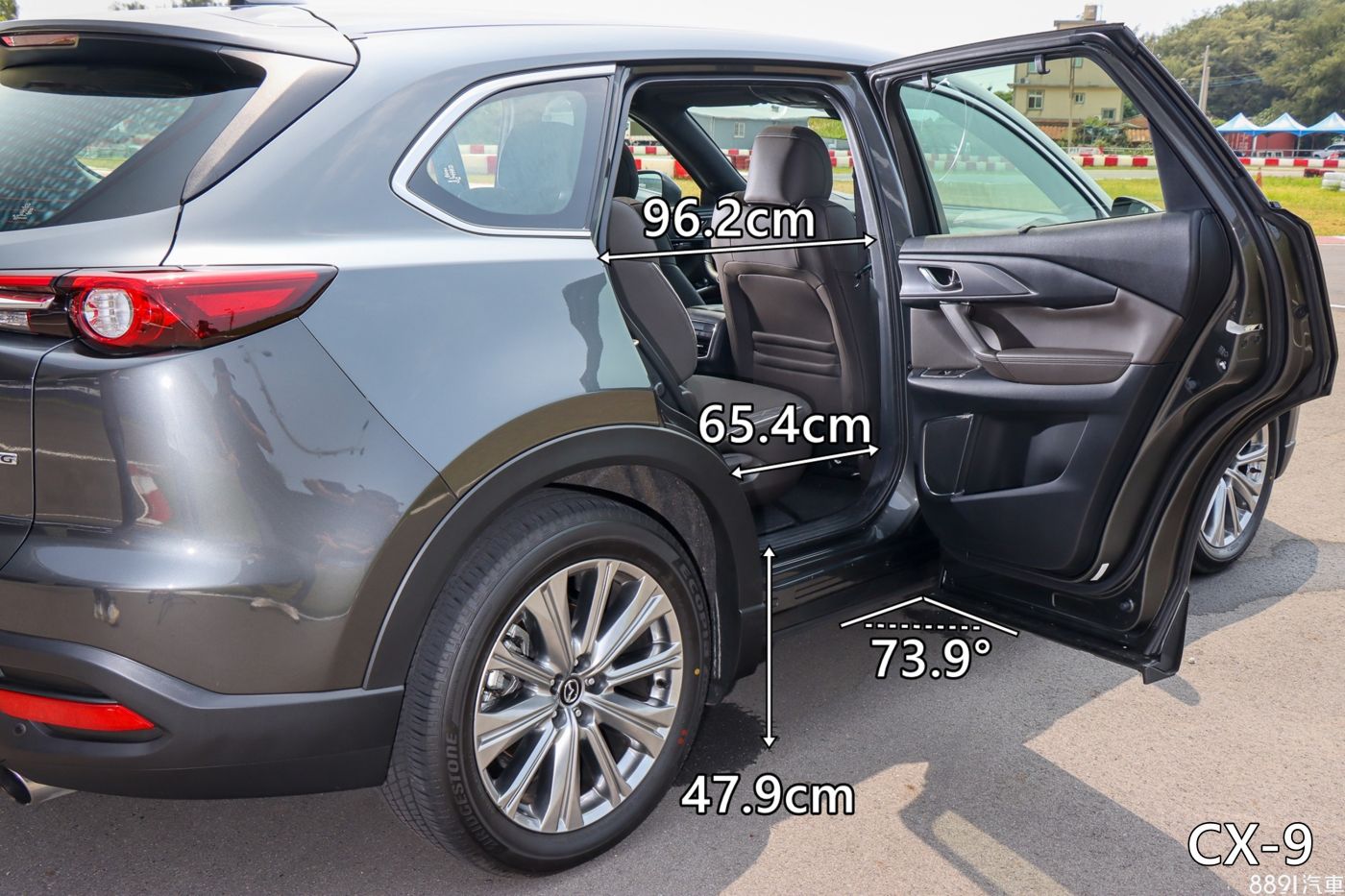 參與測試的CX-9為2022年式新增的Captain Seat六人座版本,座椅面積大、椅背角度可調範圍也大,不過也由於座椅造型影響,導致頭部空間被壓縮,車室高度是全場最低。至於進出便利性上,受惠於修長的車身尺碼,後門開口是五車之最,開口角度也最大,上下車便利性無虞。
