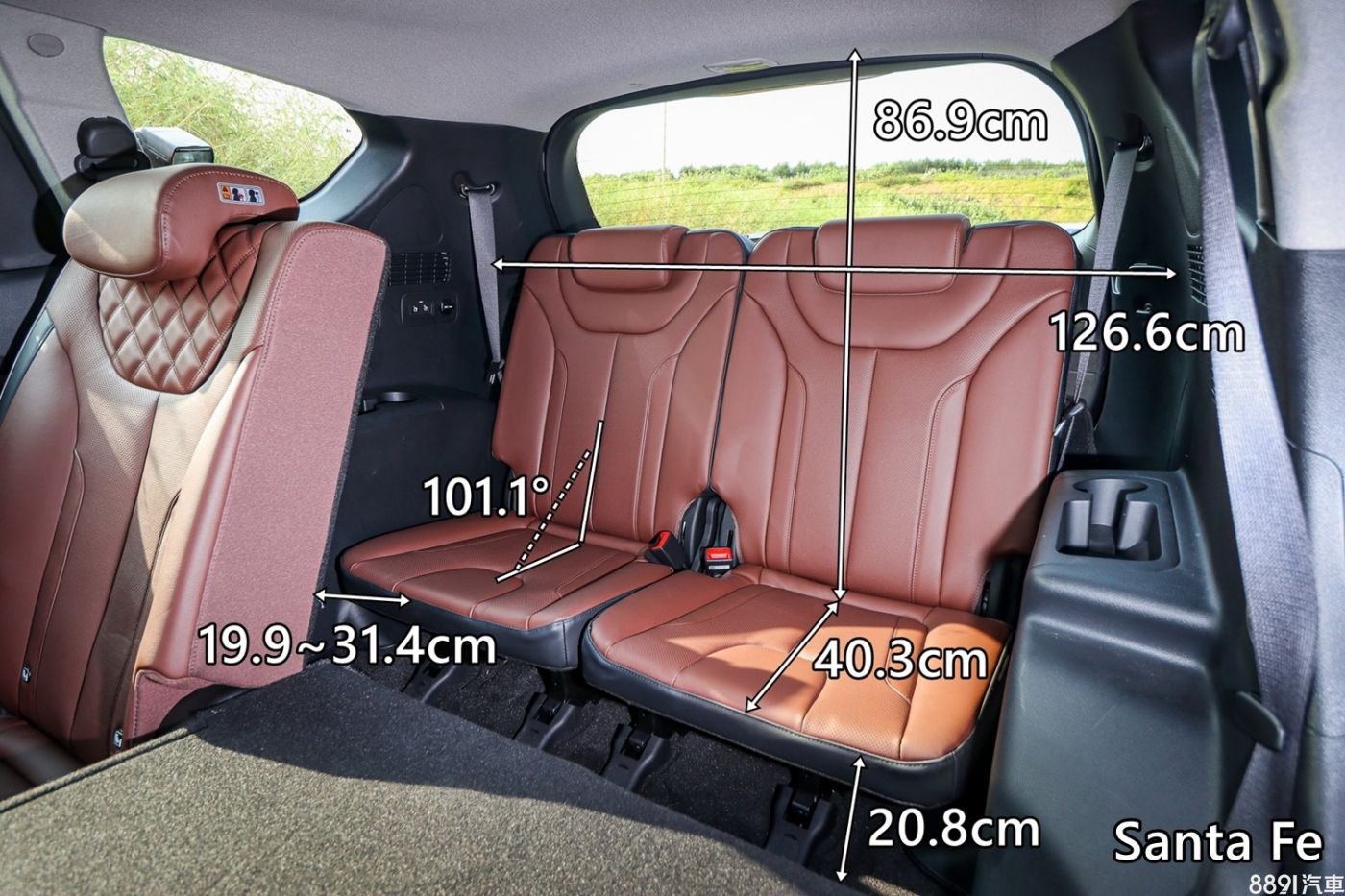 Santa Fe第三排有同場最優秀的高度表現,壓迫感不會太重,不過小缺點是椅面離地高較低,代表乘坐時會讓膝蓋彎曲角度較大,會有「坐板凳」的感覺,且膝部空間是全場最緊湊者,較不適合成人長途乘坐。