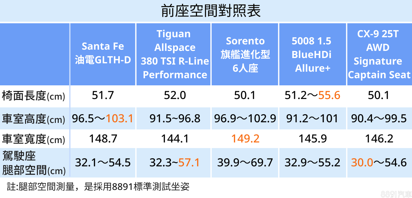5008車身尺碼是同場最小,原以為在各項數據都會「吊車尾」,不過比對下來,前座的寬度與高度其實面對另外四部車還是有中上水準,儘管有先天尺碼劣勢,但有這樣的表現已堪稱出色。