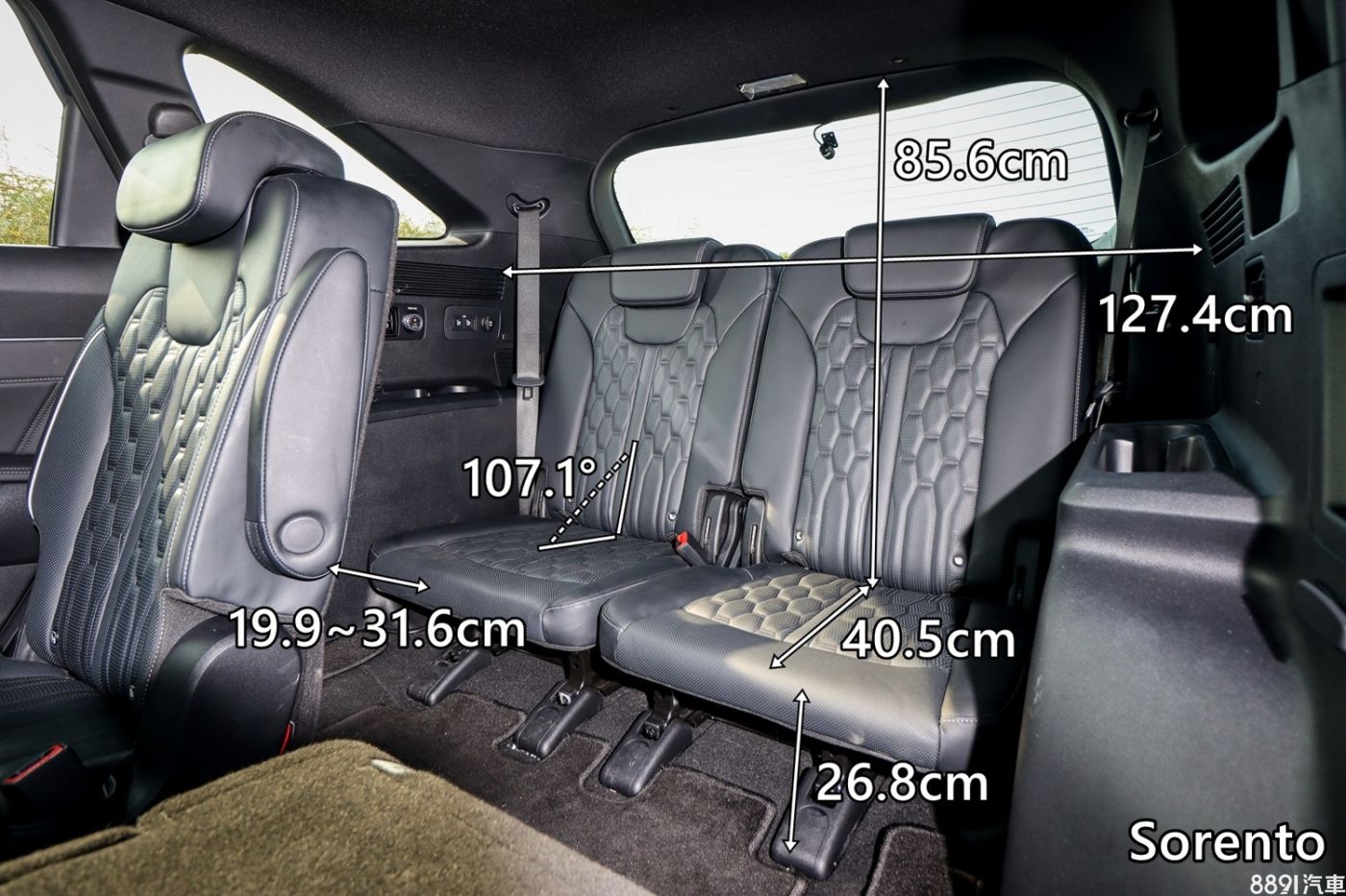 延續前面的優勢,Sorento到了第三排依舊有不錯的橫向寬度,且椅面長度、椅面離地高等多項數據皆僅次於CX-9,唯一小缺點是膝部空間不算特別突出,與Santa Fe有同樣狀況。