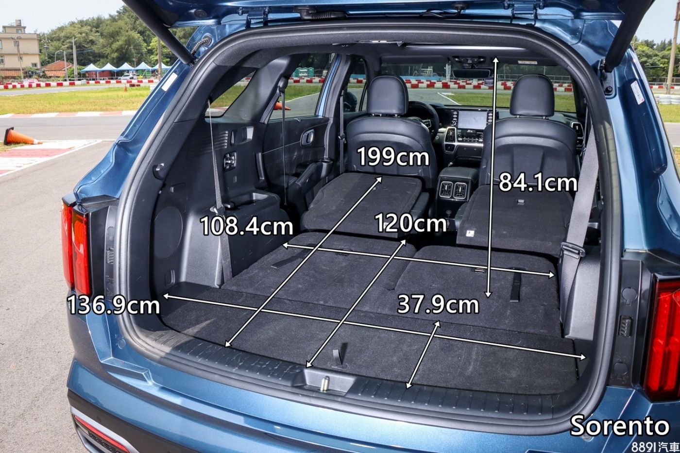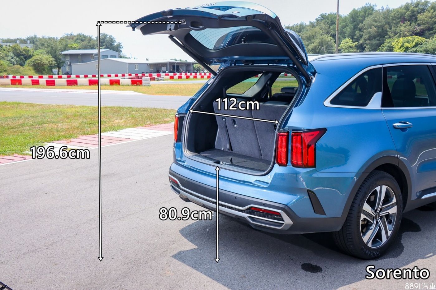 Sorento行李廂數據雖然沒有特別突出的項目,但整體仍有高水準演出,像是深度、寬度、高度都位居前段班,座椅傾倒後平整化表現也優秀,唯一缺點就是尾門開口的離地高達80.9cm,是全場最高,在擺放物品時會比較費力一些。