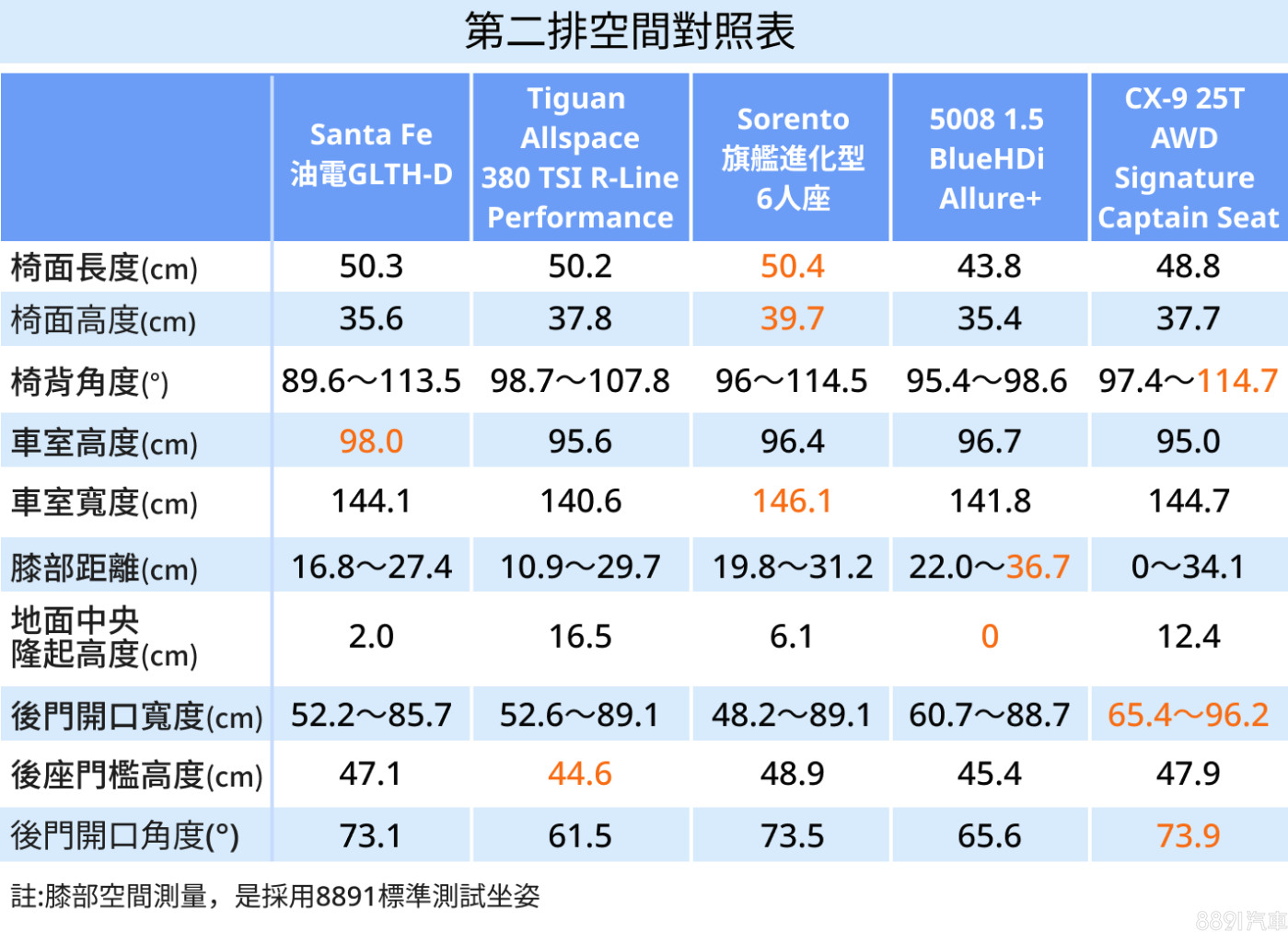以第二排空間來看,Sorento與Santa Fe都表現相當出色,尤其是Sorento擁有最寬的車室空間,兩張獨立座椅的面積大、可調範圍也大,各種身型、坐姿都能輕鬆容納,CX-9雖然也是獨立座椅,不過高聳的中央扶手較容易感到壓迫,好在縱向空間夠大,整體空間感還是十分不錯,而Tiguan Allspace與5008在各項數據上則相對吃虧,在空間規劃上並不是強項。