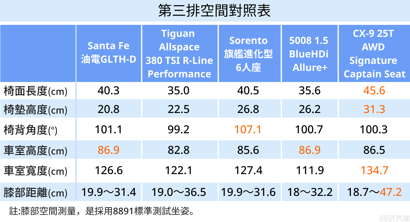 以實測結果來說,CX-9第三排空間無疑是最優秀的,多項數據都是同場第一,且座椅尺碼也最大,成人入座不會顯得屈就,有最佳的乘坐環境,Sorento則靠著優異的車室寬度帶來次佳的表現,Santa Fe寬度與高度表現也不錯,不過膝部空間與座椅高度是最大罩門,Tiguan Allspace與5008的各項數據面對其他對手則顯得較無亮點,第三排座椅較適合當作短程移動,或留給嬌小乘客與孩童。