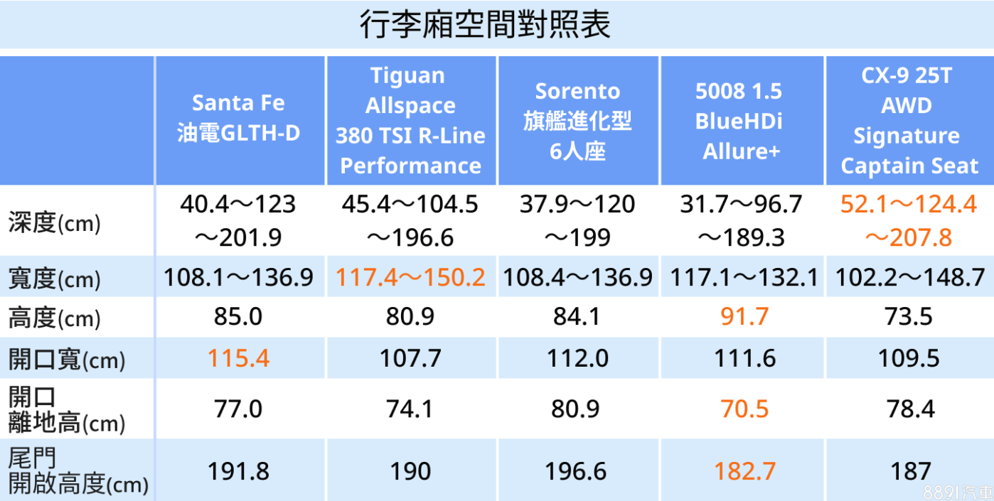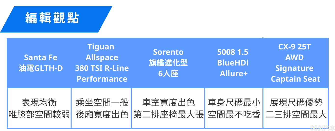 Santa Fe與Sorento雖然沒有單項數據特別突出,不過其實像是深度、寬度都有前段班水準,Tiguan Allspace雖然在乘坐空間表現不亮眼,但來到行李廂就讓人驚艷,有著全場最好的寬度數據,深度表現也不錯,5008則在較小的車身尺碼下,導致深度、寬度數據與另外四車有落差,空間機能較不亮眼,而最後CX-9有最多優勢,三項深度數據都勝過對手,明顯是車身尺碼立了功。
