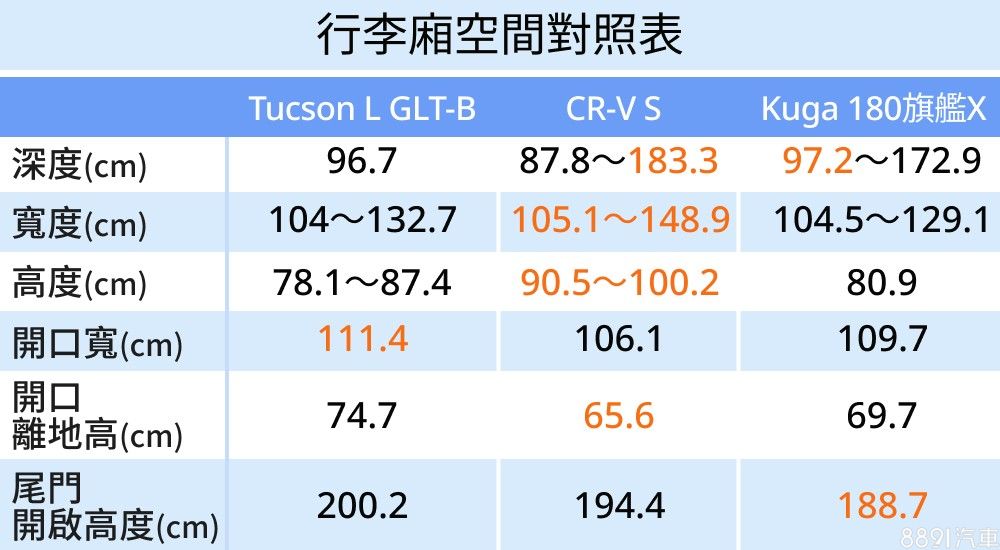 Tucson L標準狀態下寬度與深度與Kuga表現相當,Kuga雖然能夠傾倒椅背,但較為明顯的斷差不利於大型物品擺放,而且行李廂底板不像另外二車有兩段高度設定,至於CR-V,除了標準狀態下深度略短,其餘寬度、高度都頗為出色。整體來看,在大部分都是5人座的使用情境,CR-V的尾廂較寬、較高,Tucson L屬於較均衡的表現,Kuga則因高度問題而遜於對手們。