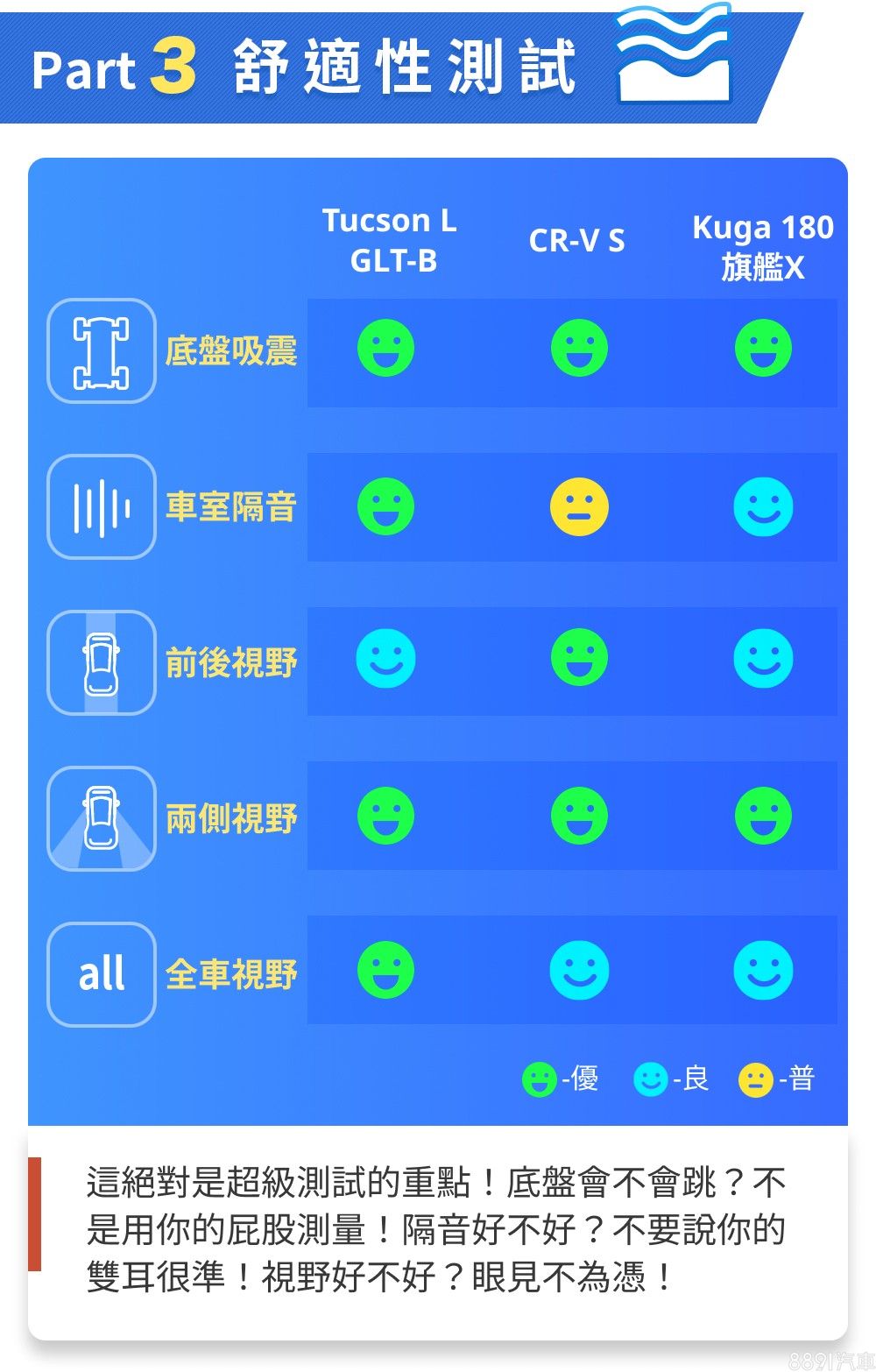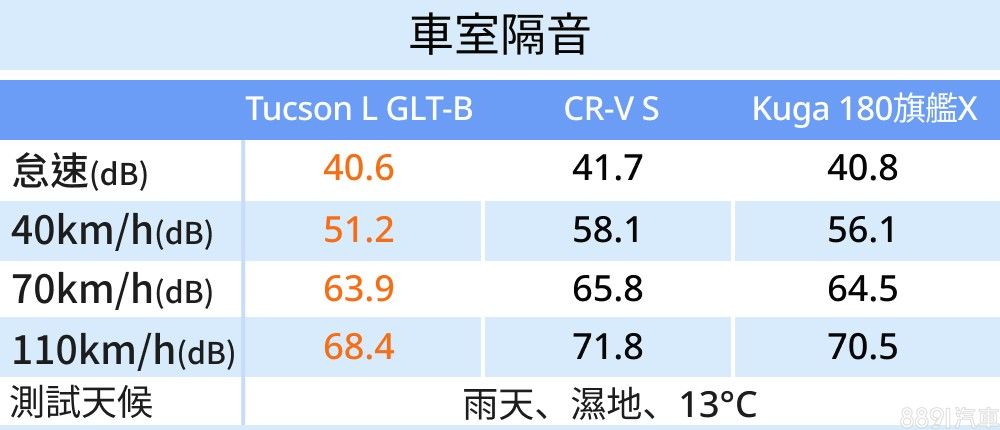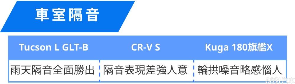 噪音測試當下為雨天,且三車都有全景天窗,雖然已將遮陽簾闔上,但雨水打在玻璃、再加上輪胎濺起的水花聲,若是隔音不夠好長途行駛還真有些惱人。Tucson L在這樣的環境下表現相對出色,不論是輪拱噪音、高速風切聲都抑制的相當不賴。相對CR-V則在輪拱噪音最為鮮明,車內很明顯就能聽到嘩啦啦的水花聲響,至於Kuga表現好上一些,不過整體還是不如Tucson L那般安靜。