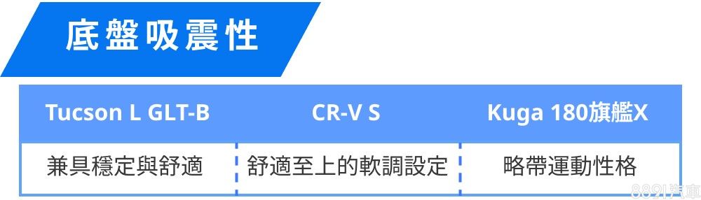 經過儀器實測,三車的底盤調校都在水準之上,符合中型SUV所應有的乘坐舒適感,但深入探究數據還是能發現三車特性略有差異,30km/h測試中Tucson L底盤回饋比CR-V直接,卻又不像Kuga那般擁有顯著運動特質,在支撐性與舒適之間取得絕佳的平衡。