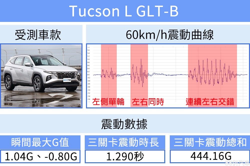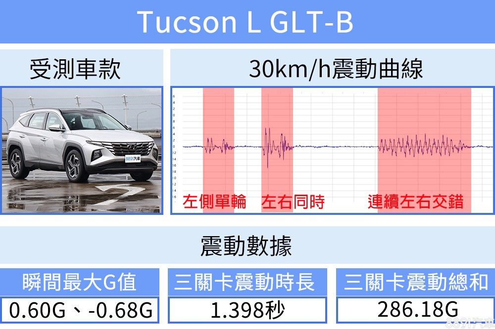 將測試時速拉到60km/h,Tucson L依然展現出色的均衡特質,面對路面突起能充分吸收,阻尼也能快速回穩車身,觀察震動曲線便不難發現,車身上下擺盪是三車中最為俐落的,碎震少、又沒有多餘二次晃動。