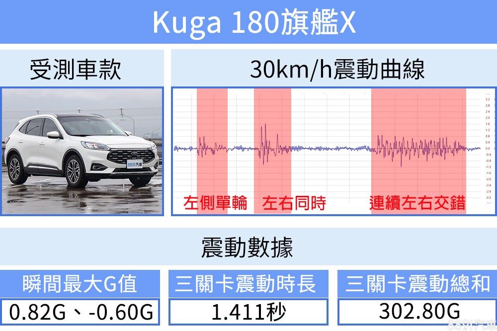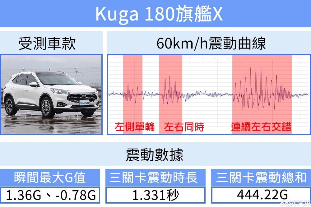 Kuga則依然維持著運動特質,最大G值三車最高、衝擊感也最強烈,不過阻尼設定得當、能拉住車身不至於過度晃動,最後G值總和與Tucson L十分接近。