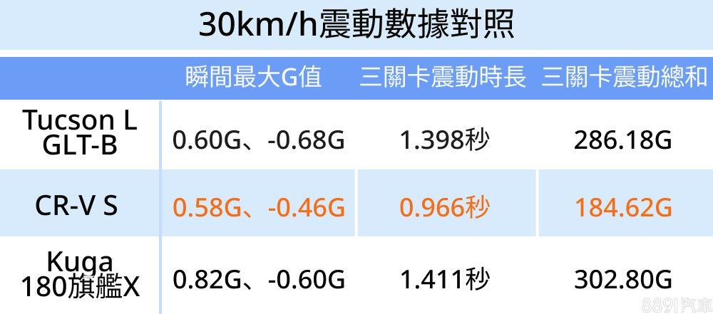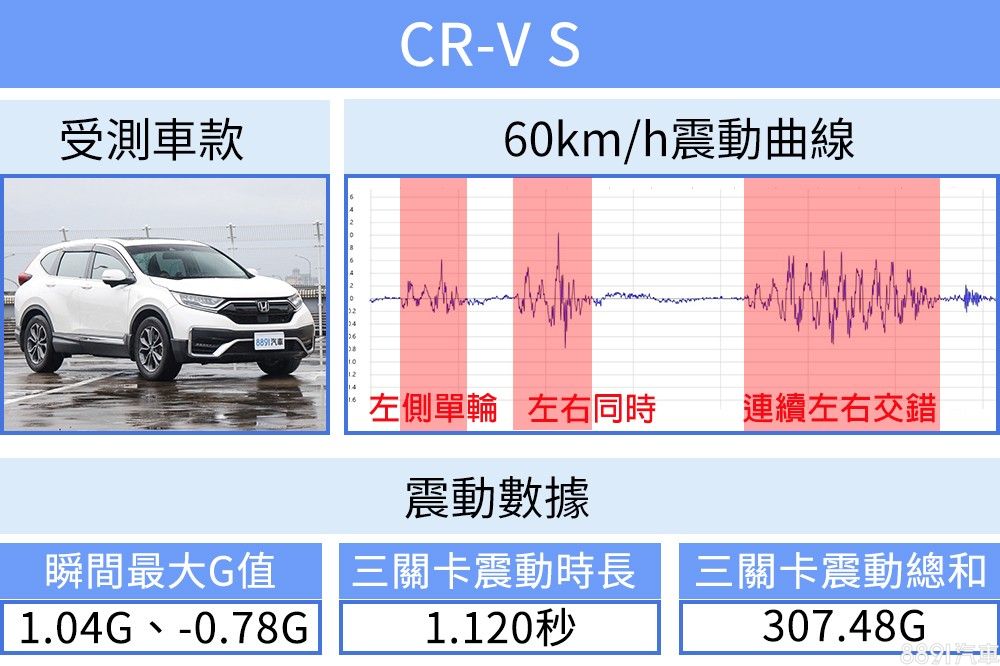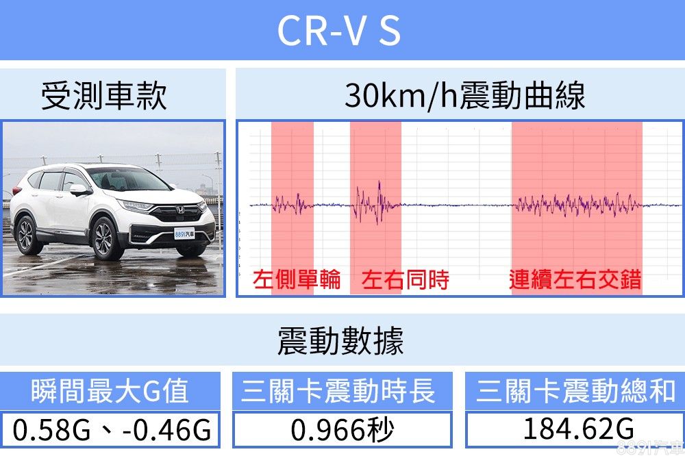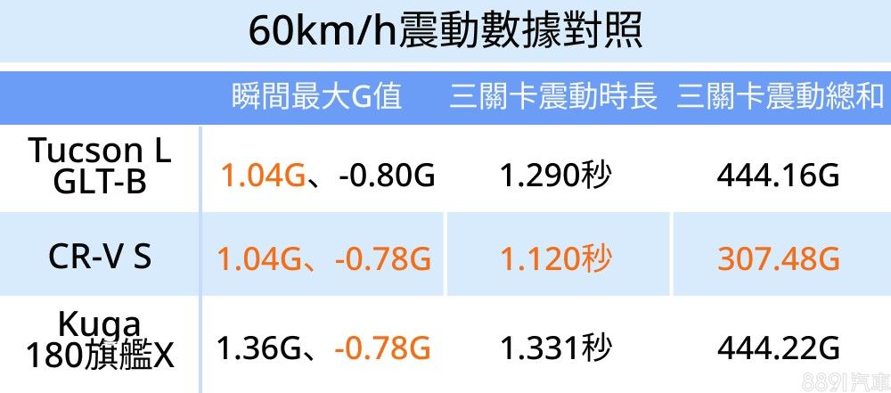 CR-V在60km/h測試依然維持著舒適本色,瞬間最大G值低、時長短,總和當然也就低,柔柔軟軟的調性最貼近消費者心中的「舒適感」。
