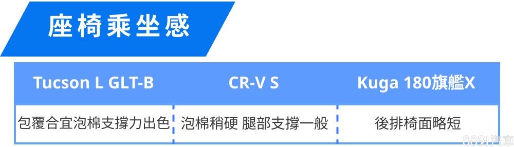 CR-V膝部空間略遜於Tucson L,但在橫向表現卻具備絕對優勢,不過後座整體造型較為平坦,大腿支撐性稍感不足,舒適性「靠空間」取勝。至於客貨車法規方面,同樣因為CR-V後廂空間足夠充裕,能滿足法規對於1立方公尺的容積要求,因此無需過度壓縮椅背角度。