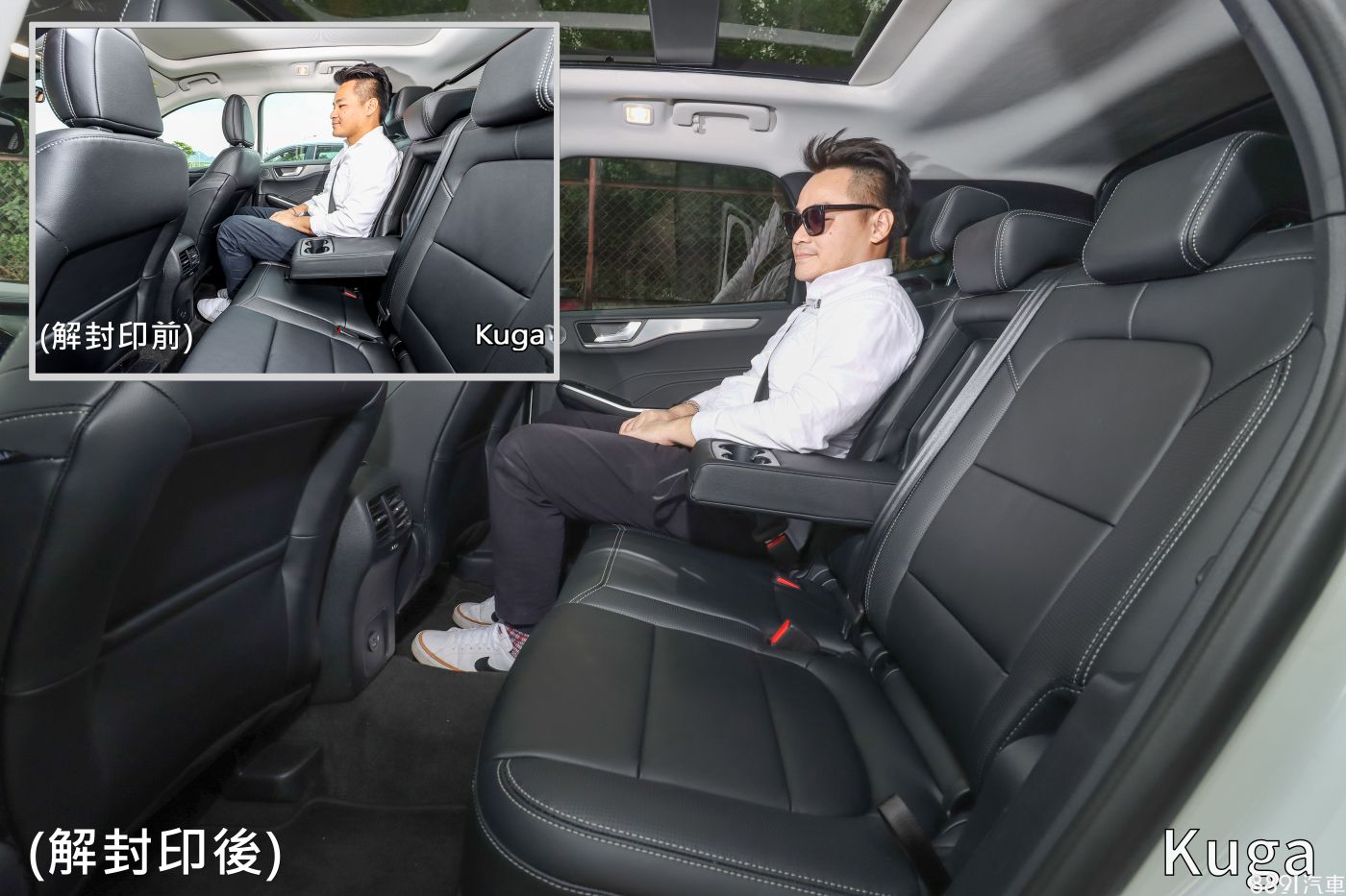 試駕的Kuga的後座經過「解封印」,可前後滑移讓膝部空間合理些許,椅背角度則具備兩段可調,整體舒適性比起出廠設置(如小圖)要好上許多,不過椅面剪裁造型仍然太過平面,且椅面長度略短、影響大腿支撐性。